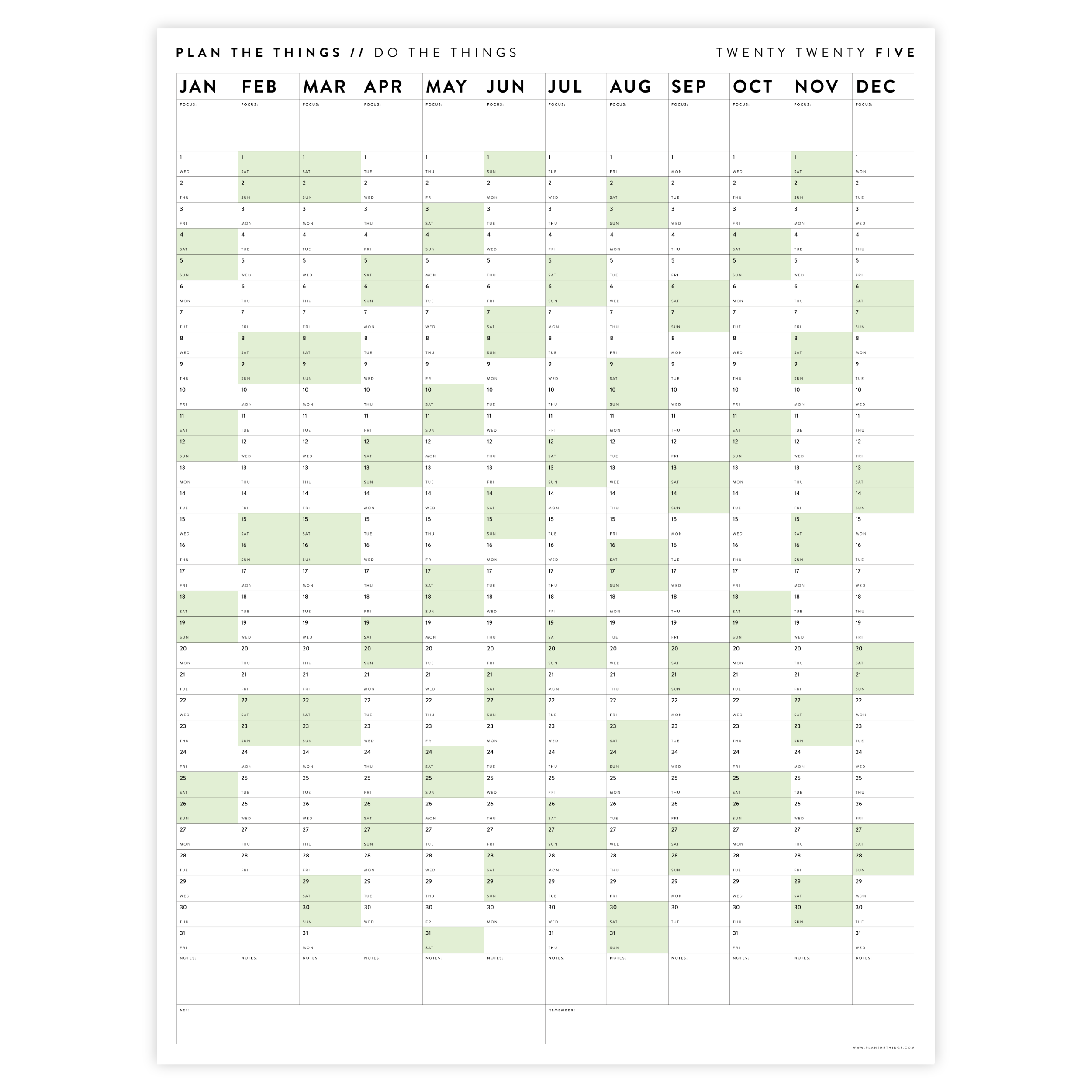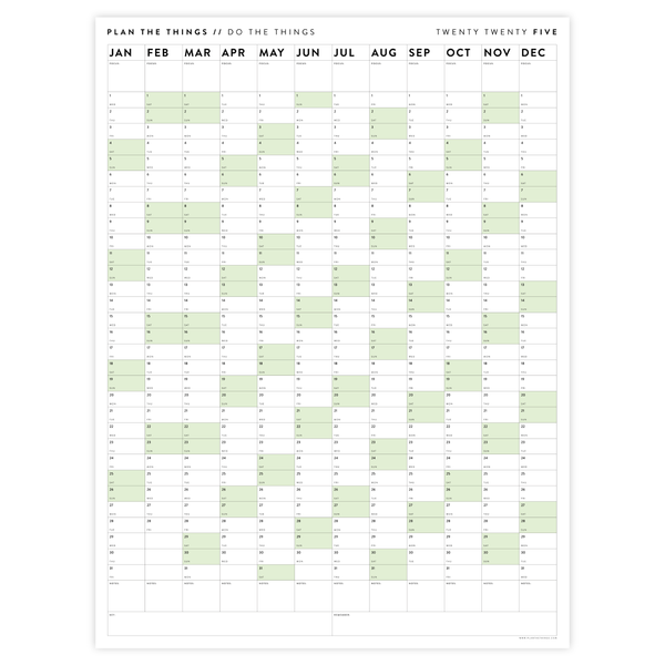 GIANT 2025 ANNUAL WALL CALENDAR | VERTICAL WITH GREEN WEEKENDS